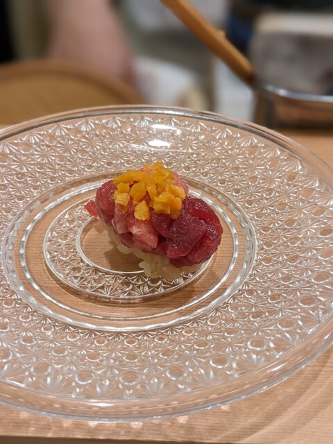 最初の一品がスペシャリテからのスタートです。サクサクの大トロの天ぷらを半分に切り、大量の雲丹を挟んで海苔で包んで手渡しです。熱々!ウニの甘さと柚子胡椒の風味、最初の一品から楽しませますよ感が伝わってきます。