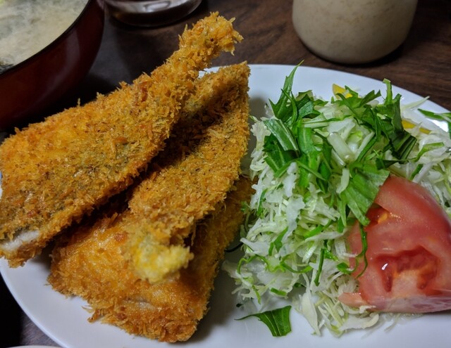 #アジフライ:黄金アジフライ、肉厚のアジ、身もふわふわで柔らかく、サクッと揚げられジューシー、めちゃくちゃ美味しい。ここのアジフライは最高!