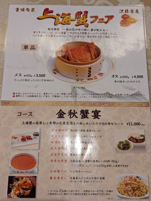 11月、上海蟹の時期と言うことで上海蟹のコース「金秋蟹宴」を予約しました。