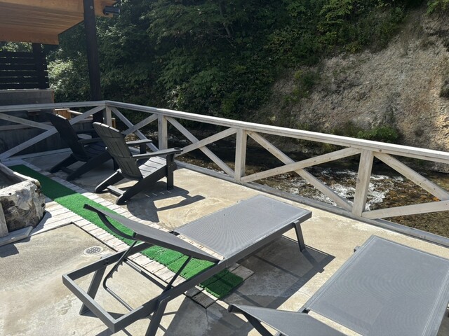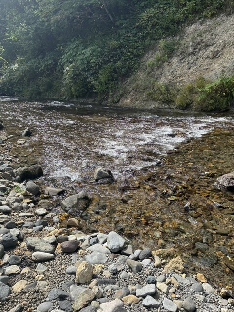 川沿いの露天風呂、せせらぎを眺めながらのサウナ、水風呂、そして川にそのまま入る贅沢な体験。奥は男女共用スペースで、自然と一体になるような時間が流れる。
