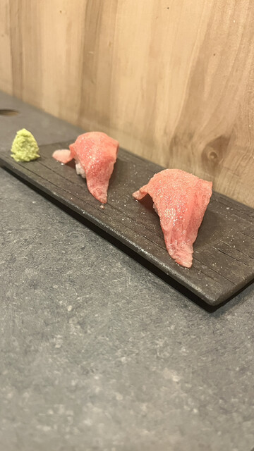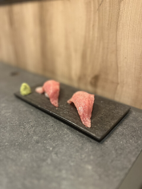 「え、本当に炙ってるの?」と疑いたくなるほどの美しい薄ピンク。お肉の甘さが口の中で溶け、アクセントの塩が全体をキリッと引き締める、計算され尽くした一貫。