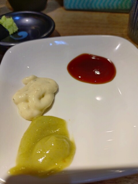 10分ほどで着丼。すでに味はついているが、醤油、ソース、タルタル、そして、「土佐ぬた」という葉ニンニクを使ったソースで頂くらしい。