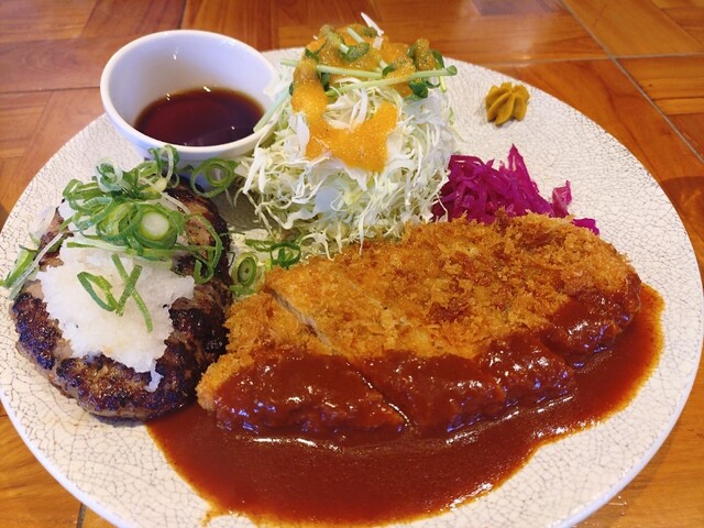 デラックスで豚カツとハンバーグ(おろしソース)を注文。10分ほどでボリューム満載のワンプレートが登場。サクサクの豚カツに、優しい味のデミグラスソースがよく合う。