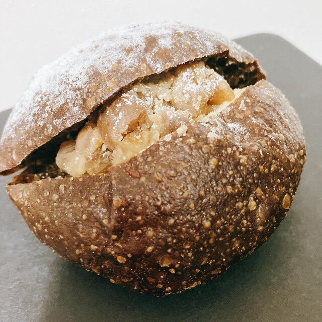 美味しい胡桃パンの表面に黒糖のグレーズの様なものが被さっています。その黒糖とパンの表面の間から