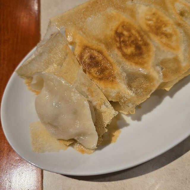 やや小ぶりな餃子で、どちらも皮はもちもちの厚め。