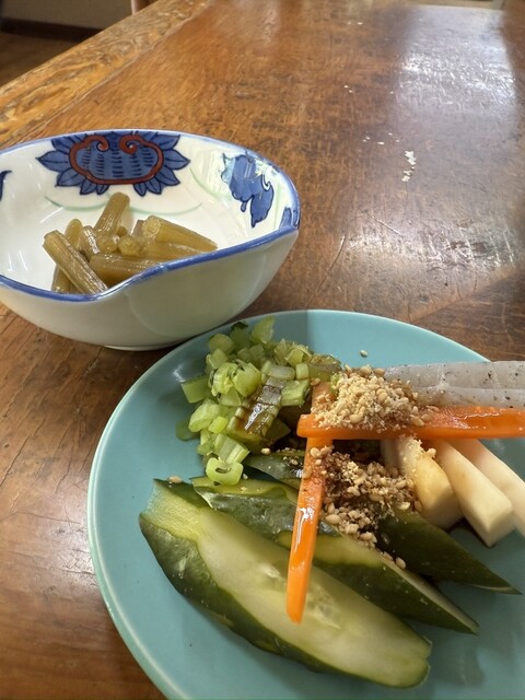 注文してすぐに、漬物とからみそ椎茸、わらびのおひたしに大根の酢漬けが。