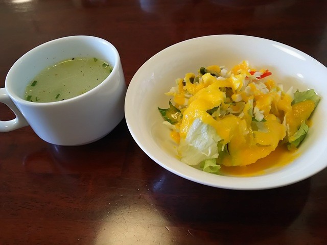 さきに、スープ、サラダが運ばれてきて、サラダの人参ドレッシングが美味しかったです
