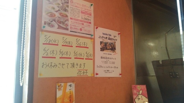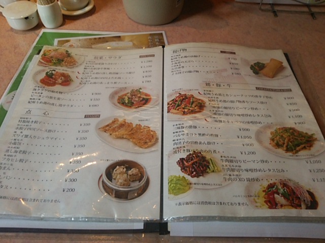 和歌山駅東口から15分ほど歩いたところにある本格的中華料理店。昼食時は整理員が店前に立つほど駐車場が一杯になる。外から見ると独りでは入りにくい雰囲気があるが、カウンター席があるので問題がなかった。カウンター席からは厨房が丸見えである。修行中なのか中南米人のコックが働いていた。