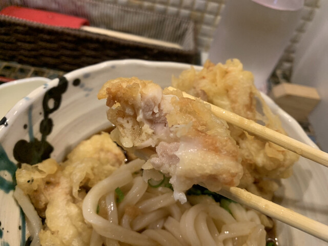 あらかじめ、うどんを湯掻く、とり天も常に揚げていて待つ事、7分くらいで着盆!