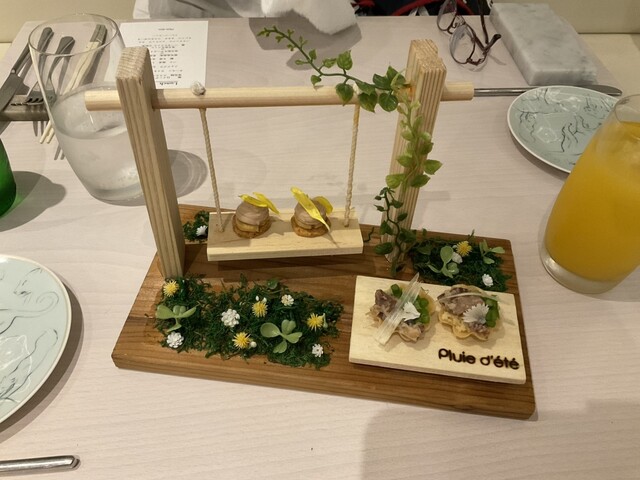 最初の前菜の盛り付けも、シェフ特製のお皿(ブランコとベンチを模したもの)もオシャレで可愛くてとても良い感じです。