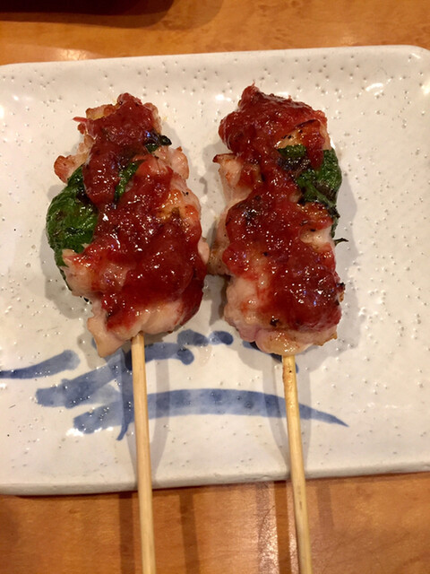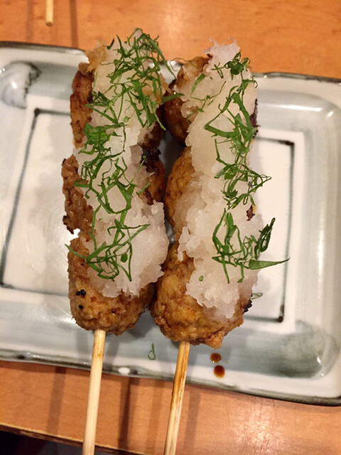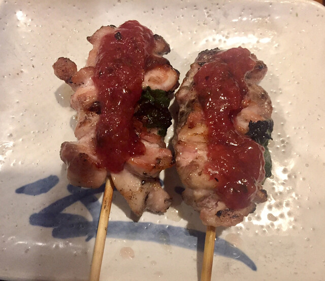せせり、牛おろしワサビ添え、しそ巻、肝パテ、ボトルワイン、、、