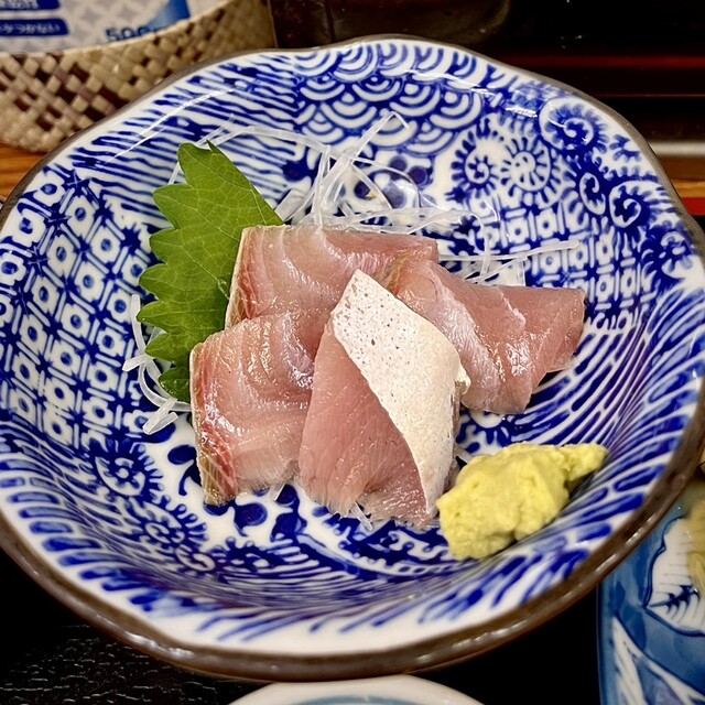 お造りはキハダマグロとハマチ。小鉢は炊き合わせ。あと味噌汁、ごはん、お漬物。