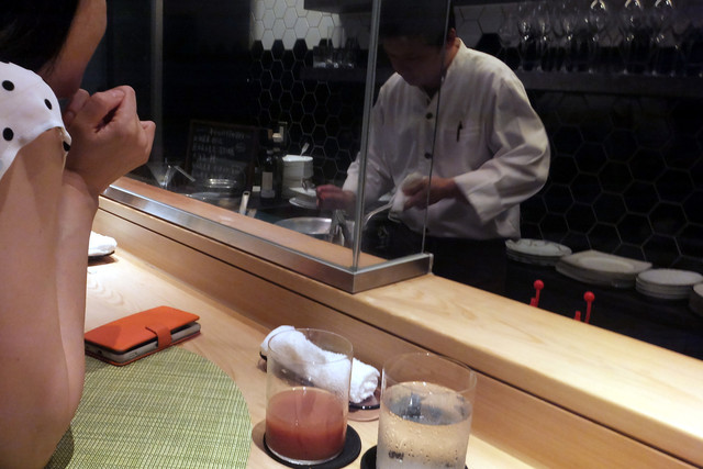友人と18時半に店で待合わせ。カウンター席の店内はほぼ満席。コースでお願いしました。食器のデザインが可愛いと友人が気に入ってました。