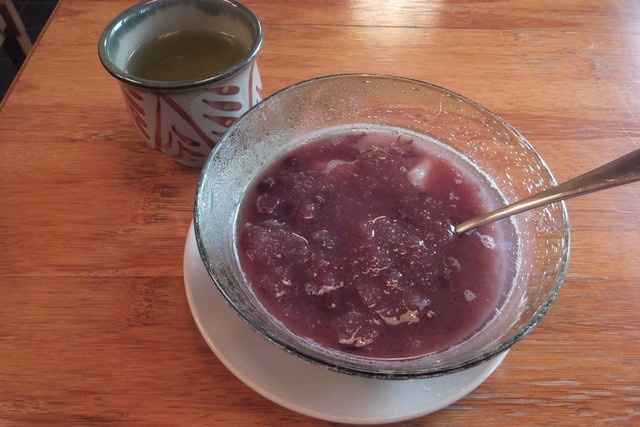 梅雨入りするかしないかの空模様でしたが暑かったので、まずは「氷ぜんざい」を注文。