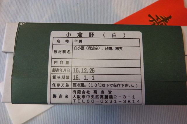 年の瀬の挨拶回りで北新地の小料理店のママから菊壽堂の白小豆の羊羹「小倉野」をいただきました。