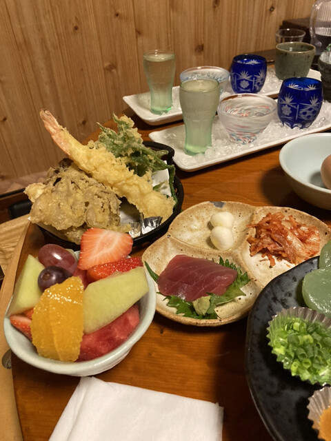 天ぷら、デザート、(利き酒セットに付いてくる)おつまみ三点盛り