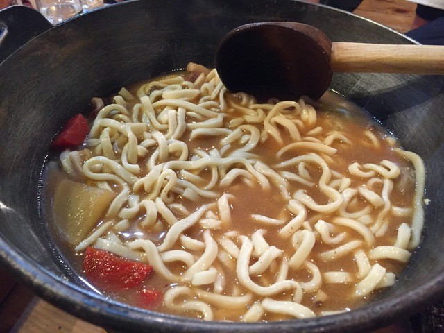 心が折れかけながらも何とか平らげると、店員さんの「〆にうどんいれますね~」の声(;・∀・)