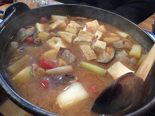 味噌味で臭みはまったくありません。根菜類を中心に野菜もゴロゴロ入っていてヘルシー!!