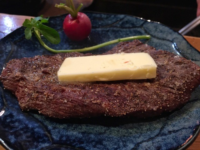 写真が悪くて美味しそうに見えませんが(´・ω・`)、赤身でさっぱりした鹿肉にバターがコクを追加して絶妙の美味さに!