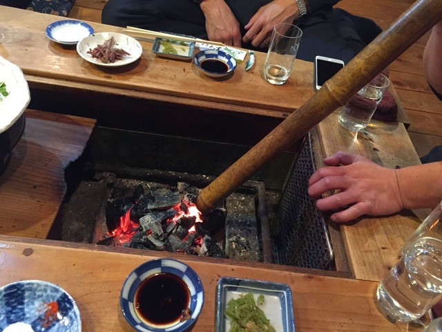 店内は板張りで、囲炉裏を囲んだ8~10人用のテーブルが2つ。
