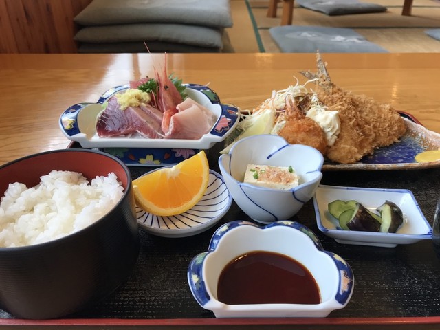 R408沿いにある、元魚屋さんの食堂という事で、期待しながら入店(o^^o)丁度、昼食時間帯という事もあり、店内は男性客で賑わっていました。かろうじて空いていたテーブルに着席し、メニューに目を通したら、定食の種類が豊富の為、迷いながら『お刺身とアジフライの盛り合わせランチA』を注文。