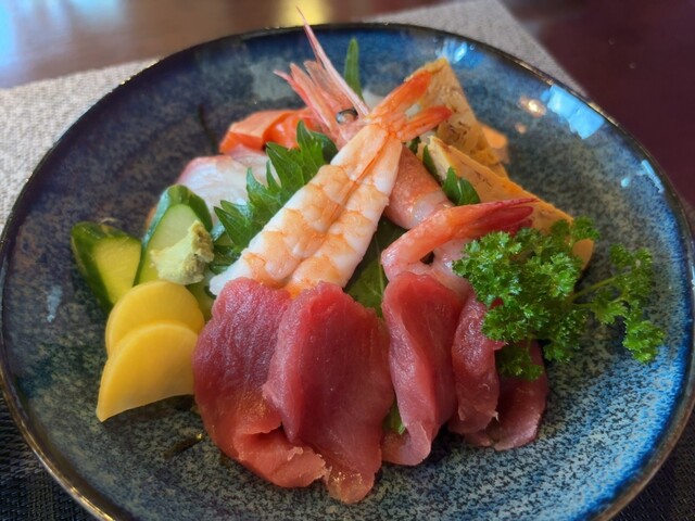 前菜として、サラダ、小鉢一点、そして煮物二点が運ばれ、メインの後は、食後のドリンクと、お値段の割に、品数が多く、そしてメインの海鮮丼のお刺身も肉厚で食べ応え充分。具の数も、海老、イカ、鮪音、玉子焼き、鰤・・・と、迷ってしまうほど具材が、ご飯の上にのっていて、終わる頃には、もうお腹いーぱい(笑)