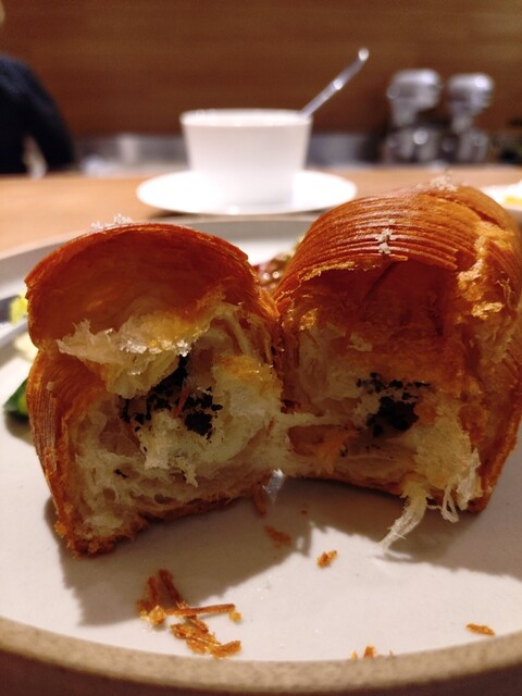よく知るクロワッサンとは形が全く異なる。もうどうやって成形してるのか…オシャレでしかない。割ってみると、黒トリュフが確かに入っていた。トリュフとバターのいい香りだ。一口食べて、う〜ん!これは美味しい!軽くてサクサクでバターの香りがよい!