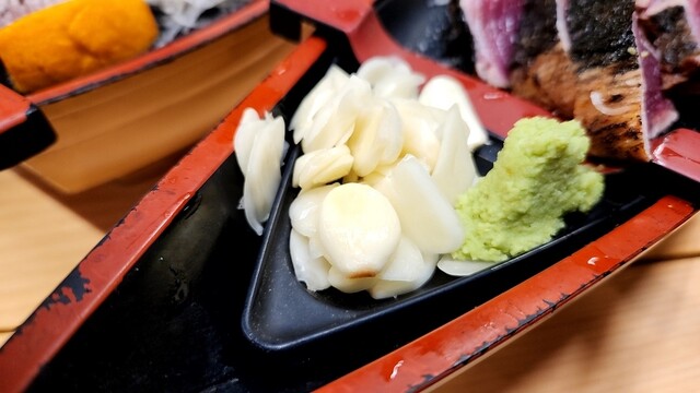 そしてメインの塩タタキ、大量の生ニンニクとワサビで食べます