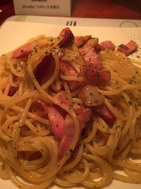パスタはガーリックがしっかりと効いていて
