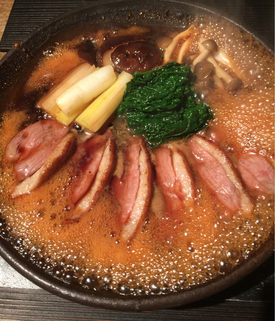 薄底の土鍋に鴨の身、ネギ、椎茸が並び
