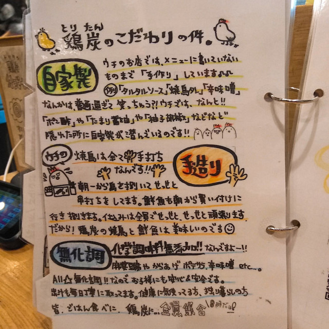 メニュー記載の鶏炭のこだわりをみて、頑張ってるな~体壊すなよ~と思う。