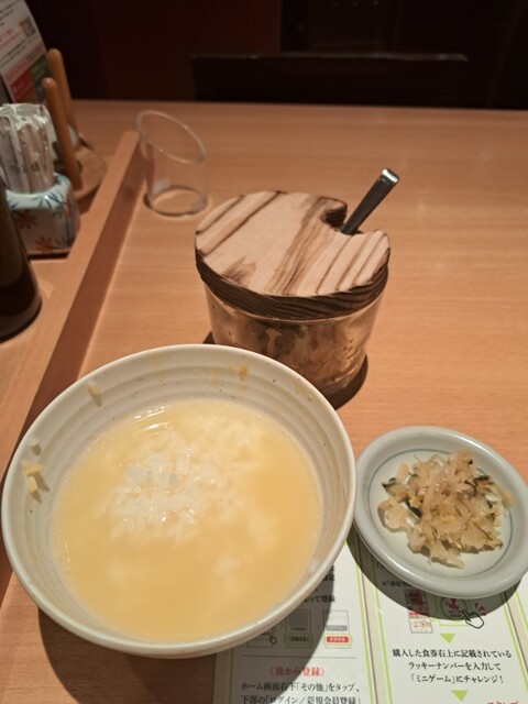 ご飯お代わり(一口)に、半熟玉子と旨辛スープを垂らして〆飯、さらに ご飯お代わり(一口)で、だし茶漬け、刻みごま白菜漬とともにで〆アゲイン。