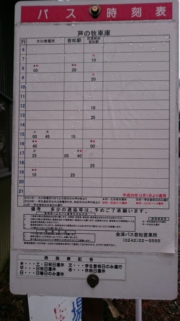 2015/11/29現在のバス時刻表。チェックアウト後、会津若松駅行きのバスは、9:20です。