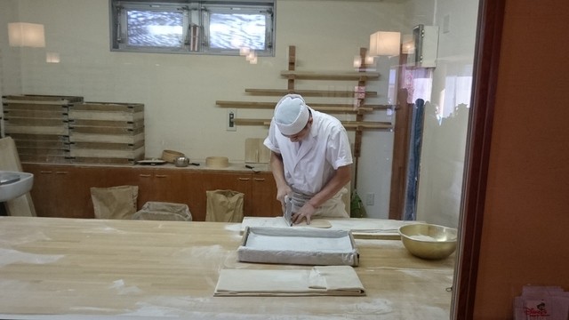 レジの近くに、そば打ちブースがあり、そばを作る様子が見学できます。