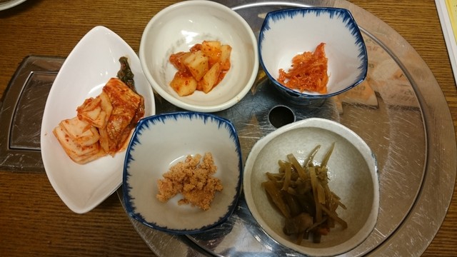 最初に白菜キムチ、カクテキ、こくずしのような料理が、