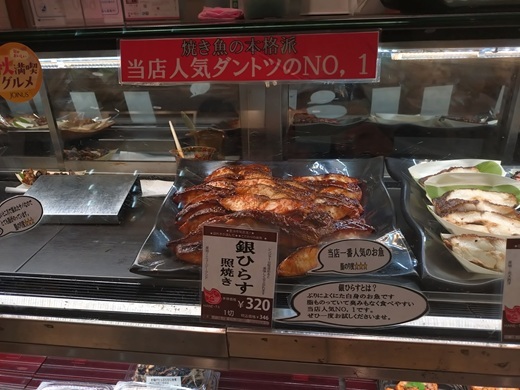 豊洲直送の魚介類を使ったお惣菜が豊富、ランチの日替わり弁当は格安