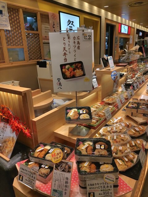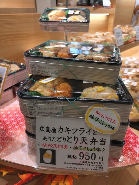 昨日、横浜駅の相鉄ジョイナスに用事があったので、久しぶりに行ってきました。用事を済ませた帰りに、前日の先輩のブログで教えてもらった「祭鳥八」へ行き、先輩オススメの現在メインで販売している「広島産カキフライとありたどりとり天弁当」を購入しようとしました。「祭鳥八」は「とり天」がメインのお店で時期により、いろいろなお弁当が販売されるようですが、昨日は、大きなスペースを取って販売していたのは「広島産カキフライとありたどりとり天弁当」でした。しかし、味付けが2種類あり、「柚子胡椒」と「生姜しょうゆ」のチョイスで迷いました。お店の方に伺ったところ、