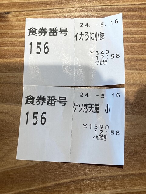 発券機で迷うことなく、ゲソ恋天重(ご飯少)と、イカうに小鉢をアドオンで、着丼まで落ち着かない気持ちを水で中和する。