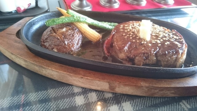 そしてメインの肉が米とともに登場です。鉄板の右半分に分厚いヒレステーキ、左半分に野菜の付け合せ。ステーキにはベーコンが巻いてあります。それではいざ、とナイフを入れます。思ったとおり柔らかい。焼き加減はミディアムレアぐらいですかね。分厚いので食べ応えがあります。最初はベーコン巻くのどうなんだろうと思いましたが、程よい塩味がいい感じです。ある意味ソースの役割。そしてまた付け合せが美味い。特に椎茸ジューシー。