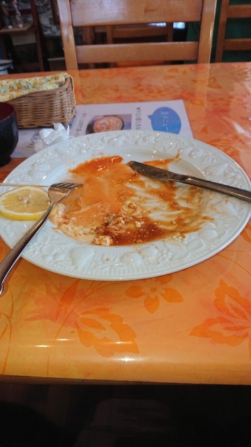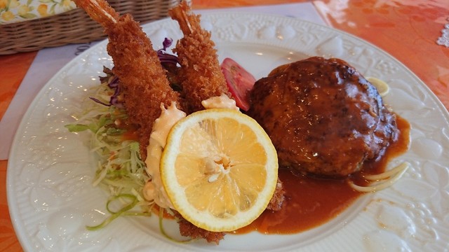 まずハンバーグ。これがビックリ。もうフワッフワ。フォークを刺して持ち上げると崩れそうになるレベル。この食感はちょっと他には無いかも。エビフライは好対照。サクサクというよりはカリカリ。クリスピーな衣です。「あれ?衣分厚いパターン?」と思ったらさにあらず。エビもプリプリ。カリカリ衣はソースがかかっていても食感を失いません。衣のカリカリにつられて尻尾まで。うん、正解。パリッパリの尻尾の香ばしさが鼻へ抜ける感じ。付け合わせのスパゲッティもサラダも手抜き無し。エノキとワカメの味噌汁もちゃんと手作り。ご飯の炊き具合も丁度いい。脇に手を抜かないお店は間違いない。自分の経験からそう判断しました。