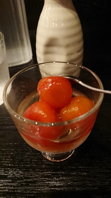 この日のお通しはゴーヤとタコの酢味噌和え。苦味に酸味、甘味、旨味、食感と揃ってこりゃ美味え。刺身はウニ、からの宮崎牛スジの煮込み。やわくて甘辛い牛スジをカラシと七味で味変しながら。季節野菜の天ぷらはゴーヤにさつまいも、ナス、カボチャ、コーン。塩でいただきます。締めは地元の芋焼酎「みやこざくら」とともにトマトのワイン煮。これ甘くてデザート感覚。一品目の導入でもいいですね。