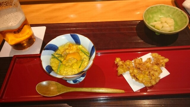 スイートコーンのかき揚げと冷製茶碗蒸しの雲丹添え。