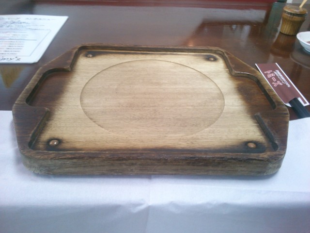 しばらくすると、まず木製のプレートとナプキン、調味料などが運ばれてきます。店員さんの説明に従い、ナプキンを広げて3分の1ほどをプレートで押さえます。そして熱々の鉄板に乗せられた料理が登場です。ナプキンの端を持って、跳ねる油に備えます。店員さんがタレをまわしかけると、ジューッという美味しそうな音とともに油が跳ねます。それがおさまったのを確認していざ実食。