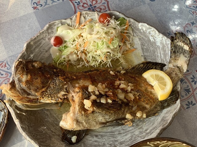 美味しい食事を堪能しながら絶景な夕焼が見れて最高!ミーバイのガーリックバター焼き、プリプリで食べ応えがあってすごく美味しくて感動。