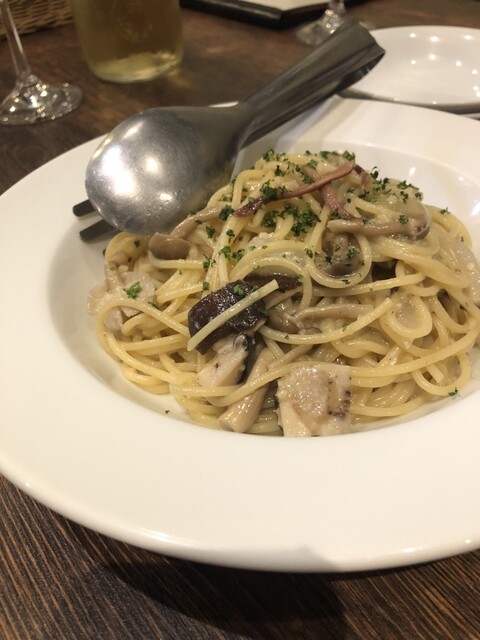 前菜にほうれん草のガーリック炒めを食べ、ガーリックカルボナーラを食べました。