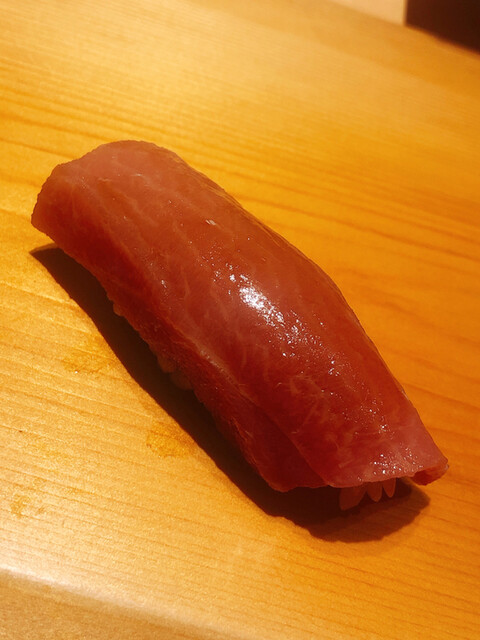 銚子の赤身。間に混とびを挟んで鉄火巻のような味わいに