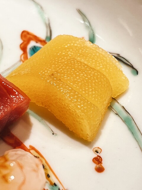 馬糞ウニとの混ぜご飯はトラフグから金目鯛に季節替わり。この皮目を炙った金目鯛と硬めのシャリをつなぐのがクリーミーなバフンウニ。