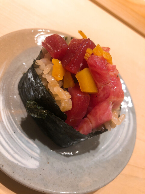 手前は大トロの砂ズリ。 奥は大トロの二週間熟成で、延縄の八丈島産。 変色具合を見てちょっと不安が走りましたが、どっこい全く問題なし。赤酢と米酢のブレンドシャリが熟した旨味をドッシリと受け止めます