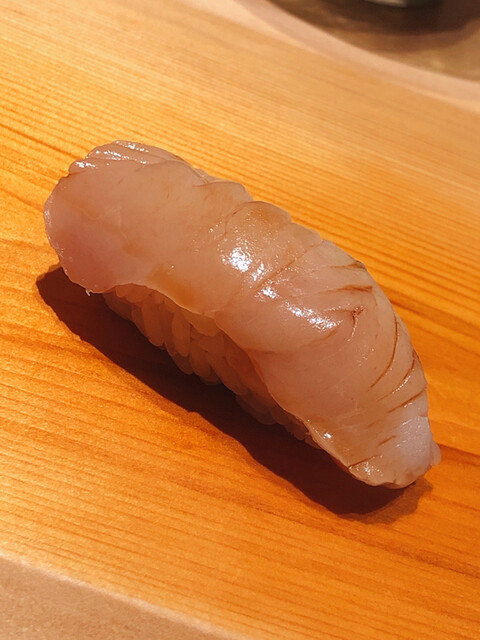 春子鯛。産地は茨城。日本のどこかで年がら年中水揚げされますが、やはり名前の通り、この時期しかお使いにならないようです。ここにもこだわりが。 完璧な脱水に脱帽。昆布出汁に漬けて旨味をパワーアップ