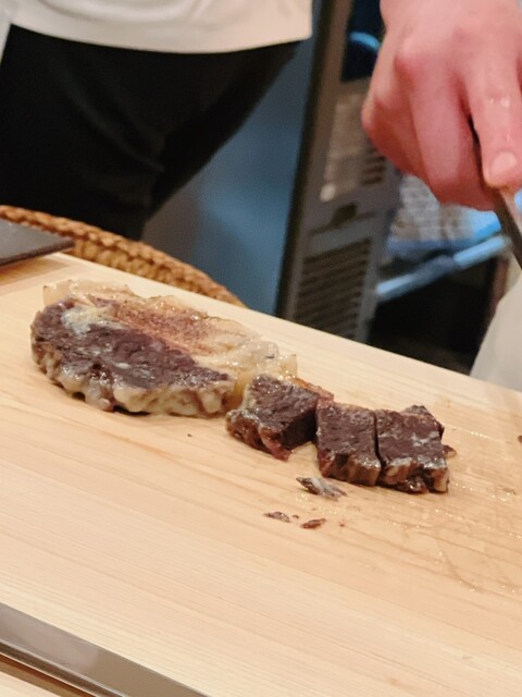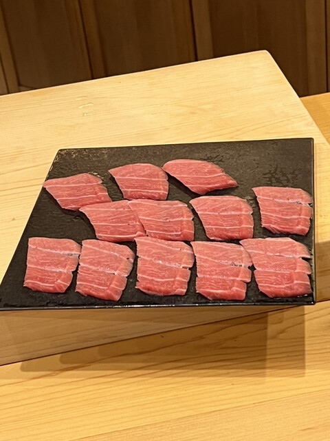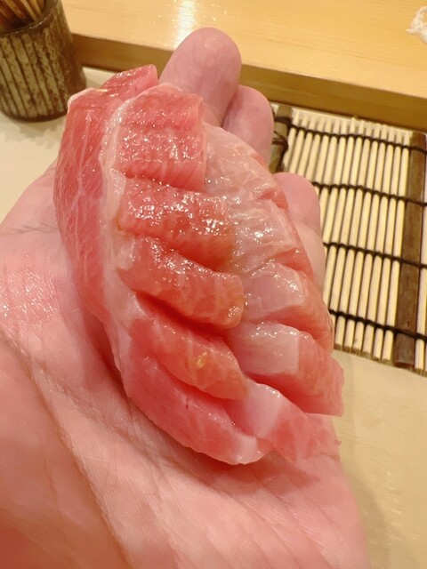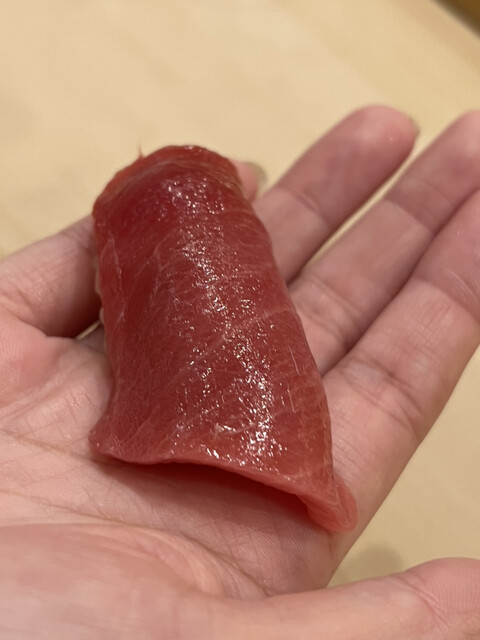 高岡氏が中トロの柵を斬りつけていたところ、となりのご常連の爺様がトリミングした端っこを見て『それが食べたい』と呟きます。これあそのお裾分け